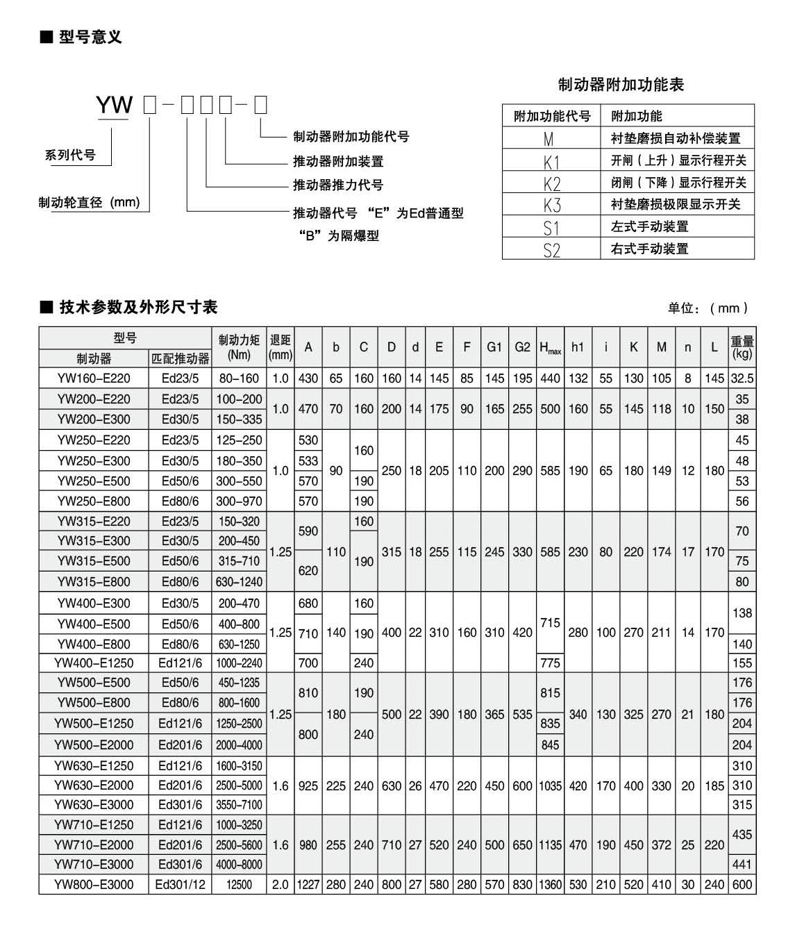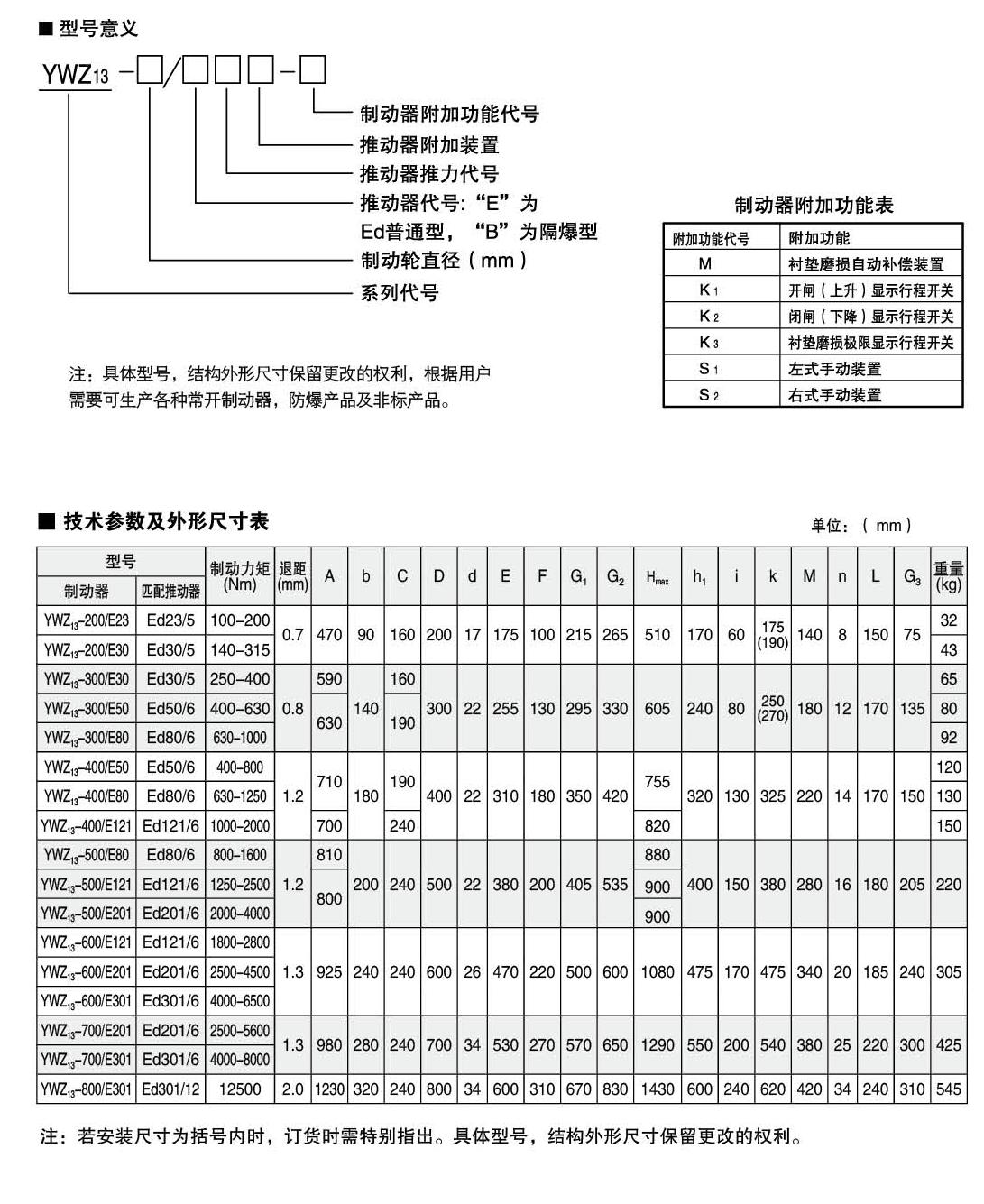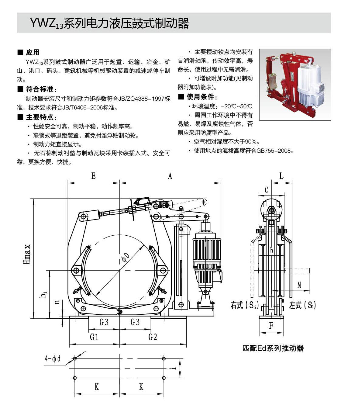 YW,YWZ13系列電力液壓鼓式制動器的連接尺寸和技術要求符合JB / T6406-2006標準;制動力矩參數符合DIN15435標準,配套符合DIN15430標準的Ed系列推動器。